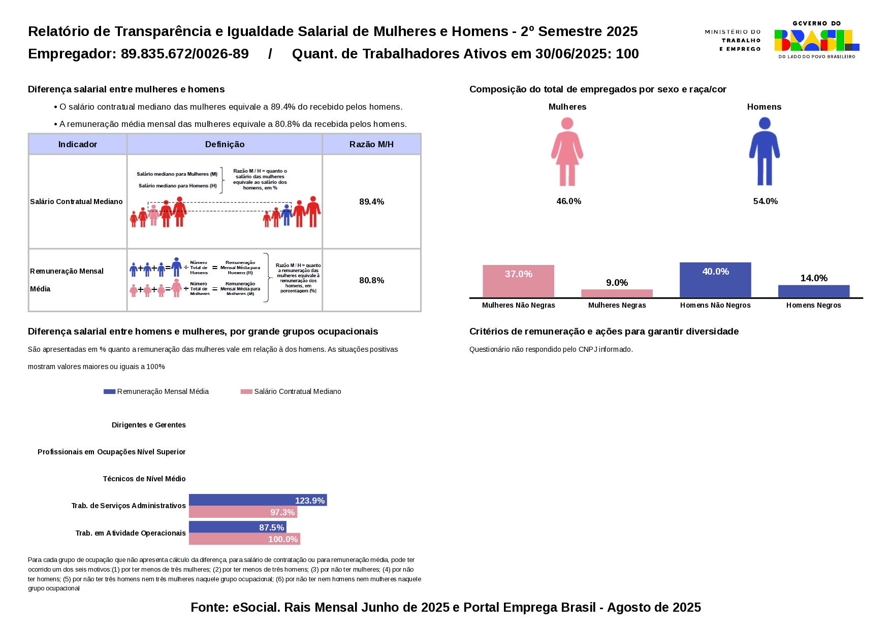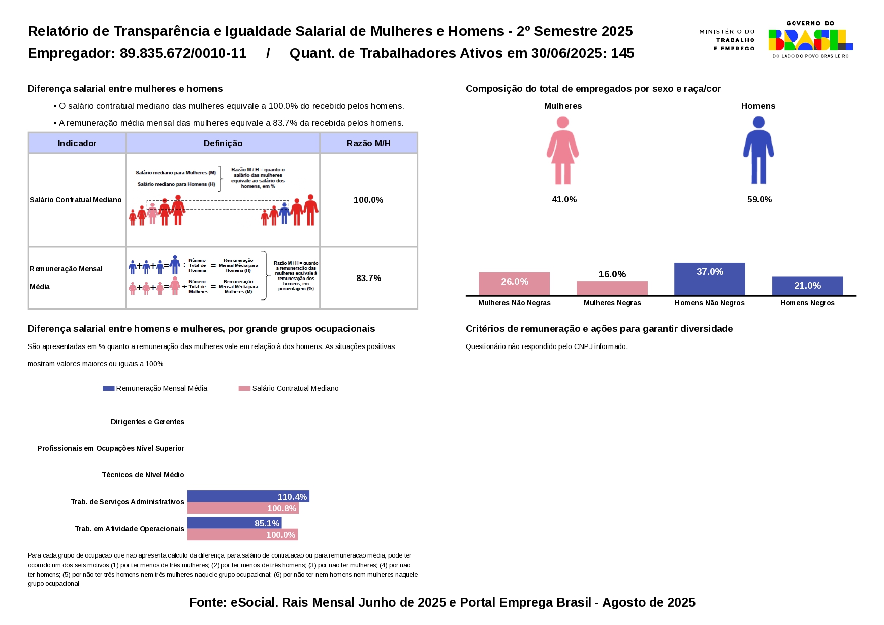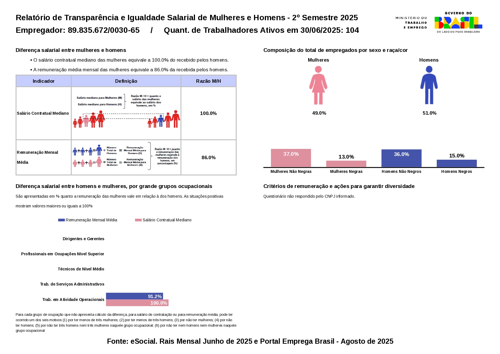 Conforme exigido pelo Ministério do Trabalho, empresas com 100 ou mais colaboradores devem compartilhar informações relacionadas à transparência salarial e critérios de remuneração, conforme estabelecido pela Lei de Igualdade Salarial nº14.611 (https://www.planalto.gov.br/ccivil_03/_ato2023-2026/2023/lei/L14611.htm). Essas informações devem ser publicadas em suas redes sociais, site ou plataformas similares, sempre em locais de fácil visualização, com o objetivo de garantir uma divulgação abrangente para seus funcionários, colaboradores e o público em geral.